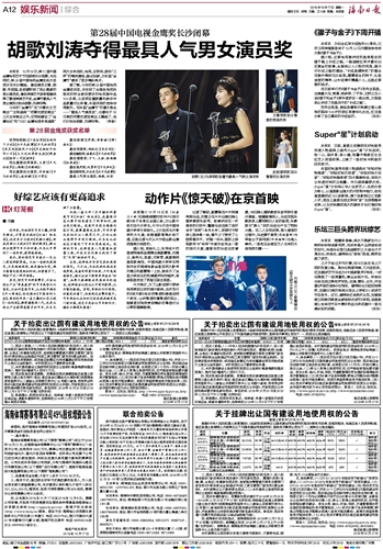 据了解,今年的第28届中国电视金鹰奖评奖,共收到了全国各地视协报送的符合参评要求的电视剧作品100多部,从奖项设置数量和参评作品数量对比来看,本届评选的竞争非常激烈。而本届“金鹰节”的最大悬念——“最具人气演员奖”,也最终于16日晚的闭幕式颁奖晚会上揭晓了,他们分别由胡歌、刘涛夺得。(钟新)