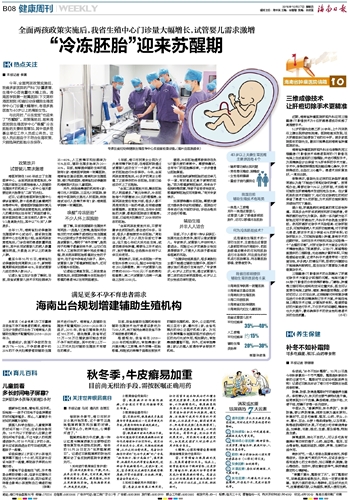 5年前,海口市民周女士因为丈夫患有精子缺乏症,在海医附院通过试管婴儿成功生下一个孩子,并将其余的胚胎进行冷冻保存。今年,全面两孩政策落地后,40多岁的周女士移植了之前保存的冷冻胚胎,目前已经成功怀上了双胞胎。