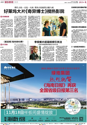 据介绍,由于今年暑期档过后全国电影票房一直疲软,近十年来一直大热并且年年增长的国庆档,全国票房也首次出现了大幅度下滑。因此,《奇异博士》的这一票房表现,就算是非常耀眼了。海南院线业内人士提供的一组数据显示,该片11月4日首日上映,全国票房达到8500多万元,票房占比达到68.2%,排片占比达到36.6%;11月5日是周六,该片全国票房达到1.19亿元,票房占比达到67.7%,排片占比达到38.8%;今天是周日,但截至今晚9时记者发稿时止,该片全国票房仍然超过了8800万元,票房占比也达到63.7%,排片占比也提升到了39.5%,首周末三天全国票房接近3亿元,成为国庆档后至近三周里唯一一天全国票房突破2亿元的助推器。