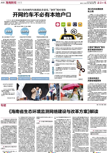 11月10日,海口市交通运输和港航管理局发布《海口市网络预约出租汽车经营服务管理实施细则(征求意见稿)》(以下简称《细则》),向社会征求意见。今后海口将对网约车及其管理平台有何约束?管理办法和别的城市有何不同?市民、车主、网约车服务平台对该细则怎么看?记者对此进行了采访。■ 本报记者 叶媛媛 见习记者 陈嘉博