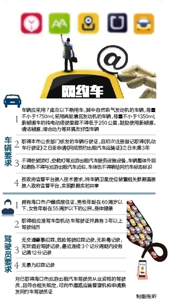 对此,海口市交通局新闻发言人徐家启表示,之所以这么规定,一是从车主的角度出发,考虑到加入网约车的司机车主不愿意在自己的爱车上喷贴标识,二是不希望网约车在外观上与出租车相似,避免扰乱出租车正常秩序。而条件相对宽松,也是希望规定更加“人性化”,让更多有条件的车主能参与网约车服务。
