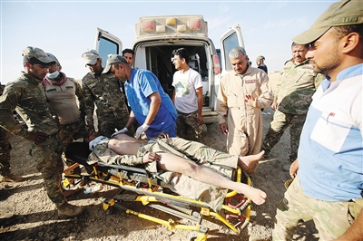 一名受伤的伊拉克政府军成员撤离前线。 新华社/法新