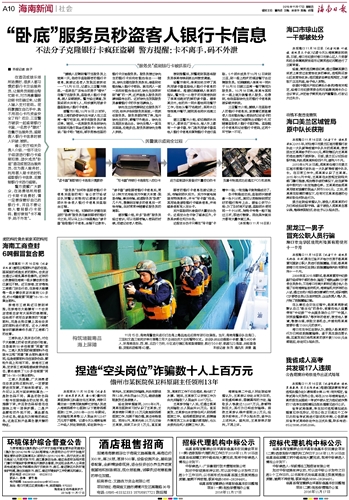 ■ 本报记者 良子在酒店或娱乐场所消费时,很多人都习惯把银行卡交给服务员,让服务员到前台帮忙刷卡,对方再拿着移动刷卡终端过来,让客人输入支付密码。密码掌握在自己手中,就不用担心卡内资金安全了吗?近日,三亚警方破获一起盗刷银行卡案,一名男子“潜伏”在餐厅当服务员,盗刷客人银行卡信息时被人识破、被抓。
