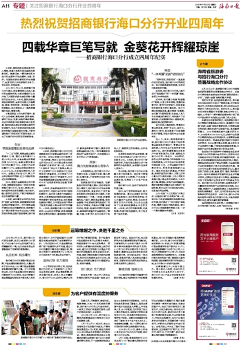 4年前,肩负着百余年历史沉淀的“招商”金字招牌,紧随着国际旅游岛建设的铿锵步伐。作为海南金融环境走出低谷的重要标志,招商银行这个国内首家完全由企业法人持股的股份制商业银行登陆海南,招行海口分行宣告成立。