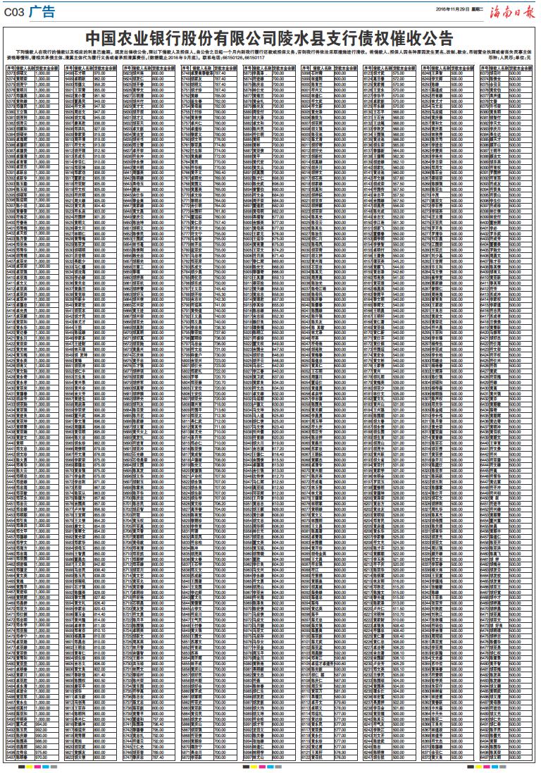 中国农业银行股份有限公司陵水县支行债权催收公告