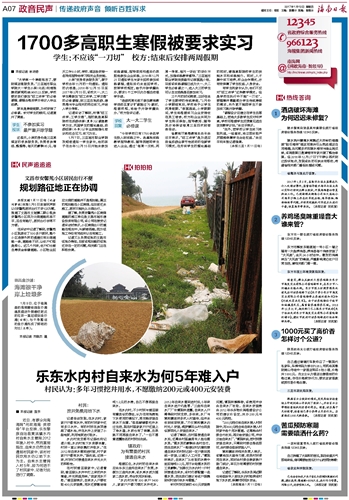 近日,有群众向南海网“问政海南·找领导”平台反映,乐东黎族自治县黄流镇水内村自来水主管网2012年接入村中,然而直到现在,自来水仍然没有通到村民家中,该村村民饮用水仍以地下水为主。自来水主管网入村5年,却为何进不了村民家中,记者对此进行了调查。