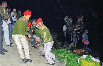 1月14日,救援人员搬运在印度比哈尔邦首府巴特那附近水域落水的遇难者遗体。 当地时间14日下午,一艘客船在印度比哈尔邦首府巴特那附近水域倾覆,造成至少19人死亡、20人失踪。 新华社/法新