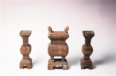 一套神台“三供”雕刻工整,没有花哨的雕刻图案却有着简约、大气的线条。据介绍,这样的“三供”多是出现在清末至民国年间,琼北地区的一些富裕人家用来祭祀祖先时插香、插蜡烛。