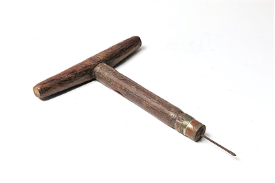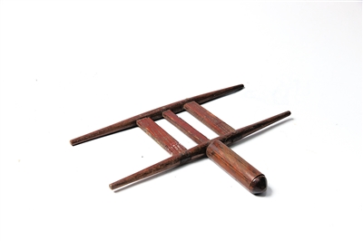 “叮叮叮……”金属敲击着黄花梨制作的木质外罩,发出清脆的响声,这个看上去像木匣子一样的东西,中间由线串着金属,实际上是一个挂在牛或羊脖子上的铃铛,因为花梨木材质密、木头硬,所以在金属敲击下发出的声音也很响亮,人们也就能顺着铃铛声寻找到正在吃草的牛。这个民国时期的木质铃铛颇有几分生活趣味。同样利用黄花梨“响亮”特质制成的还有一个琼剧乐器——梆子,戏班子里的师傅只要轻轻敲击就能发出脆亮的声响来。这几样文物都是符集玉多年来收藏所得。