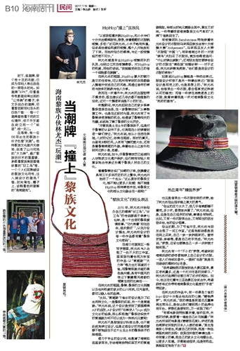在海南,有一位86年出生的黎族小伙子也爱“玩潮”。他将黎族文化里开天辟地、创造了山川河流的“大力神”,推广黎族纺织术的黄道婆,承载着黎族美丽爱情故事的“甘工鸟”等,一个个人们耳熟能详的黎族文化符号,注入其设计的潮流T恤、时尚背包、帽子上,诠释着他所理解的“海南潮流”。