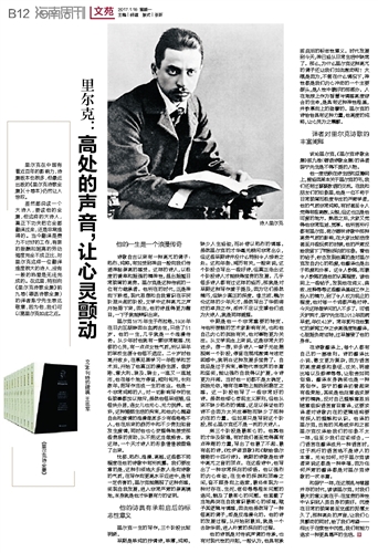 诗歌自古以来有一种高亢的调子:热烈、纯粹,有如受到神启一般向我们传递神秘崇高的感受。这样的诗人,以极度的谦卑和超强的精神性,显出超越日常琐屑的高贵。里尔克是这种传统的一位有力继承者。他所在的时代,正是神向下跌落,现代思想和自我意识在平民阶层兴起的阶段,文学中这种高亢之声开始降下来,因此,他的诗显得更为醒目,一下子就能辨识出来。