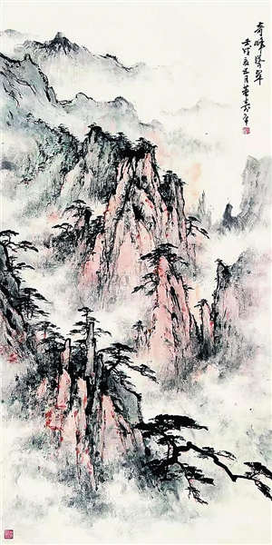 以“黄山巨擘”为例,因为勤于写生,所以董寿平胸列五岳。因此,他画黄山与其他画家不同,从不自根部画起,也不表现完整的山峰,而是用墨的深浅、浓淡来表示山势的层次,给观者留下丰富的想象空间,从而拓宽了艺术的视觉空间。