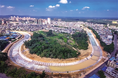 鸟瞰松涛灌区东干渠军屯段配套工程。据了解,这一项目为了配合儋州市银河公园建设,安排在绕那大城区银河公园区域(东干0+000—5+270渠段),打造儋州市区一道亮丽的风景线。目前,工程量已完成约90%。本报特约记者 吴文生 记者 苏晓杰 摄