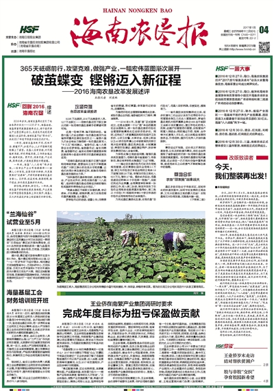 本报海口1月15日讯(海报集团全媒体中心记者刘棠琳)“一报在手,全面掌握海南农垦最新的改革发展动态。”2017年伊始,海南农垦报全新蝶变,依托海南农垦和海南日报报业集团资源优势,精心策划,全新改版,为读者新年送上了一份有温度、有深度、有速度的报纸。2016年11月,按照省委、省政府部署,海南农垦报正式移交海南日报报业集团管理。为更好地发挥媒体优势,宣传、记录、见证海南农垦改革发展,在海南日报报业集团和海垦控股集团的重视和大力支持下,海南农垦报开始酝酿改版。