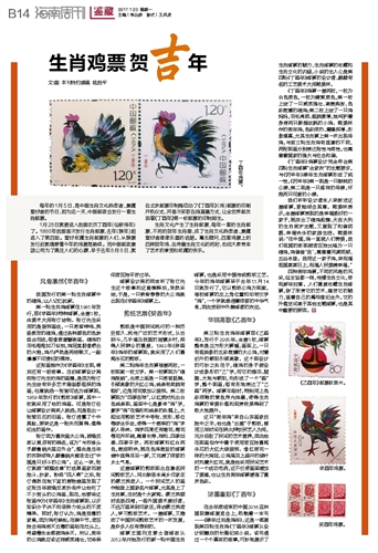 1月28日就要进入我国农历丁酉年(俗称鸡年)了。1980年我国首次发行生肖邮票,去年(猴年)起进入了第四轮。爱好收藏生肖邮票的人们,从猴票发行后就猜想着今年的鸡票是啥样。而中国邮政集团公司为了满足人们的心愿,早于去年8月8日,就在北京邮票印制局启动了《丁酉年》(鸡)邮票的印刷开机仪式,并首次采取在线直播方式,让全世界邮友观看《丁酉年》第一枚邮票的印制诞生。