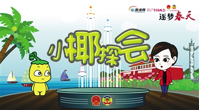 本报北京3月5日电 (海报集团全媒体中心记者刘麦)2017年全国两会期间,南海网推出“小椰探会”特色栏目。3月5日,呆萌岛民“波波椰”和南海网主播卢天琴一起互动对话,以“动漫+实景”模式为大家传递“两会”热点。今年的政府工作报告中都有哪些海南机遇?“小椰探会”第一期节目,就由南海网主持人和卡通人物波波椰,通过一问一答的形式,讲述总理报告中六大利好:房价、脱贫、话费、环保、创业和就医。