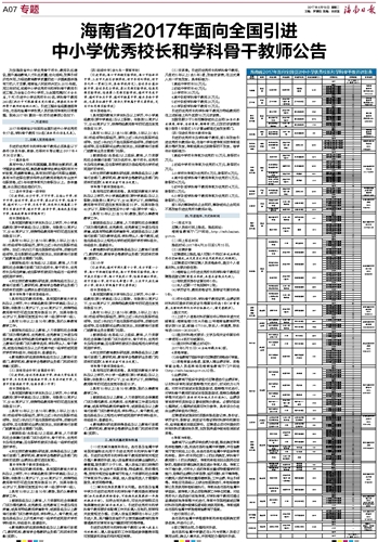 2017年海南省计划面向全国引进中小学优秀校长17名、学科骨干教师159名(具体岗位信息见表)。