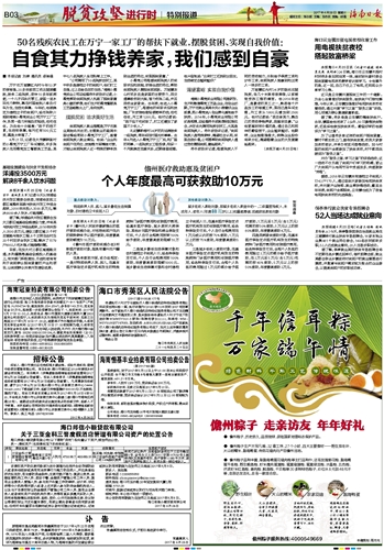 万宁市万城镇红光村今年53岁的李育强,20多年前因工伤左腿被截肢,肢体二级残疾,老伴10多年前病逝,一个儿子四处打零工,家里一亩水田无力耕种,靠在村里给别人修自行车为生,生活无保障。今年初,他被确定为建档立卡的贫困户,经市残联介绍到海南小椰壳实业公司万宁工厂工作,负责一些力所能及的轻活,包吃包住。为此他十分感激:“我干的活不累,生活有保障,每月还有500元工资,真是太幸福了。”