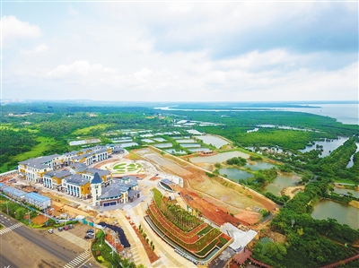 4月26日,俯瞰文昌八门湾红树林海上森林公园。作为文昌市实施“十三五”规划开局之年的重点招商项目,目前除了商业街主体工程完工外,音乐喷泉开始进行土建施工,栈道、桥梁、停车场等各项公园配套也在稳步推进当中,已完成工程量的95%,预计于今年国庆开园。本报记者 袁琛 摄