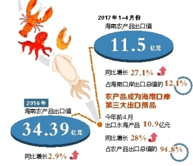 海口海关提供的数据显示,今年1-4月份,海南口岸农产品出口总值为11.5亿元,其中出口水海产品10.9亿元,同比增长28%,占农产品出口总值的94.8%。