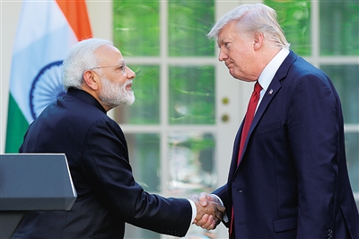 6月26日,在美国华盛顿白宫,美国总统特朗普(右)和到访的印度总理莫迪握手。 美国总统特朗普和到访的印度总理莫迪26日在白宫举行会晤,讨论了贸易和安全领域等问题。特朗普敦促印度政府放松对美贸易限制。新华社/美联