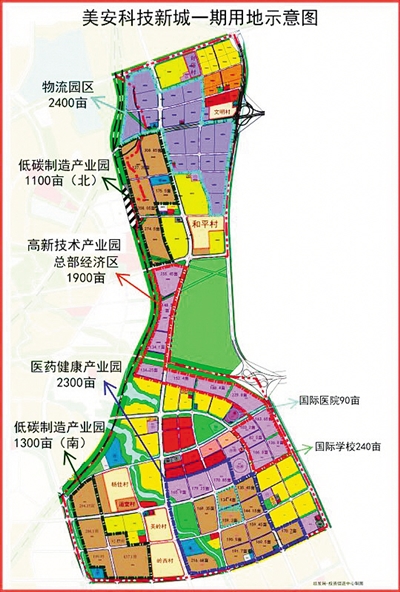 美安科技新城一期项目占地16.73平方公里,将形成三个功能片区:北片区主要是低碳制造产业、现代物流为主,中片区主要以科技研发、商业金融、总部经济及居住产业为主,南片区以医药、食品、保健品及健康服务为主。