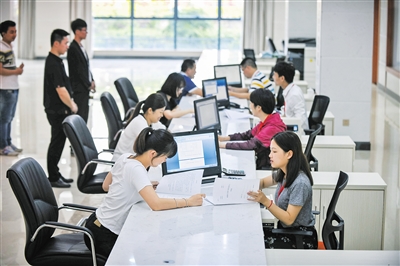 海口国家高新区政务服务中心,工作人员有条不紊地为企业代表办理业务,工商、税务、消防等职能部门都进驻高新区,所有审批事项集中办理。 本报记者 袁琛 摄
