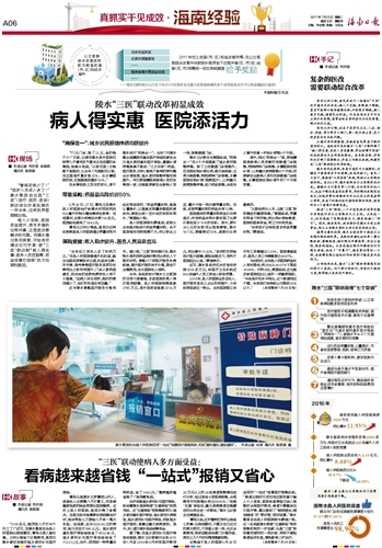 这得益于县人民医院5月26日启用的“一站式”结算医疗报销系统。“患者出院时只须在相应服务窗口输入个人信息,医院将直接垫付纳入报销的合规医疗费用,患者只需缴纳自付医疗费,真正做到了‘随来随治,随走随结’的‘零时限’即时结算。”陵水黎族自治县人民医院院长蔡雄介绍,这一系统是陵水探索“五道保险”联动报销机制的一次创新,也是“三医”联动惠民便民的一项内容,有助于减轻患者经济负担,避免影响二次治疗。