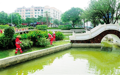 7月26日,环卫工人在白沙黎族自治县文明湖进行清洁工作。 本报记者 苏晓杰 通讯员 林呈 摄