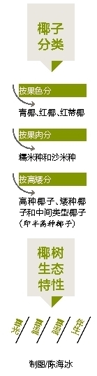 记者查阅了多份有关椰子的文献,综合起来椰子有几种分类方法。按果色分为青椰、红椰、红蒂椰三类;按果肉分为糯米种和沙米种两类。但目前普遍将椰子分为高种椰子、矮种椰子和中间类型椰子(即半高种椰子)。