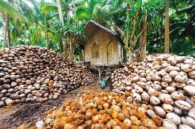 文昌东郊椰子公园内堆积如山的椰子与小木屋。 海南日报记者 李幸璜 摄
