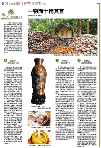 文\海南日报记者 单憬岗“一物而十用其宜。”这是丘濬在《南溟奇甸赋》中,对椰树的高度夸赞。椰树浑身是宝:椰肉香甜,做成多种食品,营养丰富;椰水清醇,是热带上等饮料,可酿美酒;椰壳古朴,可做成椰雕,多姿多彩;还有椰棕可造麻绳、可做坐垫,椰根可治痢疾、可做牙膏,椰叶可编竹席、可做墙体,椰花可做饮料、可做糖果;还有椰木是良材,可做家具、建材、工艺品……