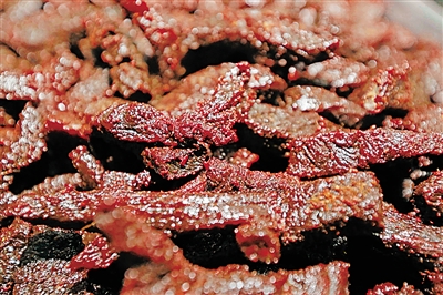 将一片长坡牛肉干放入口中慢慢咀嚼,口感筋道十足,阳光下的晾晒显然增强了牛肉独特香味。“我们家牛肉干的特点是新鲜,当天牛肉当天做,所以口感特别好。”郑晓晓说。