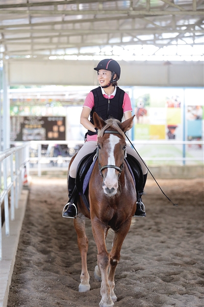 马背上的吴茜,满脸自信,她轻提缰绳,在一圈又一圈的轻快步练习中,享受着独特的驾驭感。马场里,吴茜很认真,享受马术带来美妙体验的同时,她还不时向旁边的教练请教技巧,又让旁人用手机录下视频,回去加以纠正细节,学得很用心。