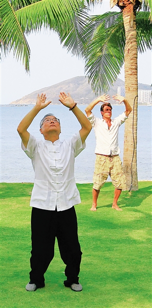 我省中医药服务受到不少外国游客青睐。 图为一名外国游客跟随中医师锻炼。