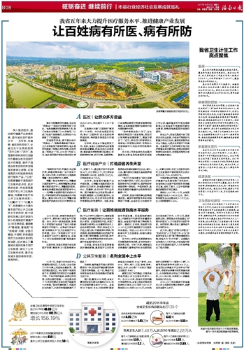 深入推进医改、推动医疗健康产业持续发展、提升城乡医疗服务水平……五年来,在省委、省政府的领导下,全省卫生计生系统按照“顶天立地”(“顶天”,就是要积极吸纳和引进国内外最前沿的先进医疗技术和管理,服务于海南当地老百姓和来到海南的患者及游客,打造海南顶尖和独具特色的医疗服务产品。“立地”则是要着眼于海南医疗卫生服务起点低、起步晚的实际,夯实海南基本医疗和公共卫生服务基础,完善基本医疗和公共卫生服务体系)、“比翼齐飞”(“比翼齐飞”,则是要在大力提升基本医疗和公共卫生服务水平的同时,极力创新和发展以医疗旅游为核心的海南医疗健康产业)的发展思路,着眼解决“看病难、看病贵”和“防病弱”问题,全面打基础、补短板,积极推进医药卫生体制改革和机制创新,初步建立了覆盖城乡居民的基本医疗卫生制度,强化了公共卫生服务体系,基本实现城乡居民病有所医、病有所防。医改 让群众多方受益