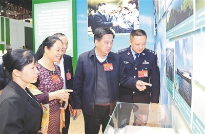 10月20日,参观“砥砺奋进的五年”大型成就展时,三沙生态保护的图片吸引潘金吉、王金花、羊风极、田湘利和冯晖等代表(由左至右)驻足观看。