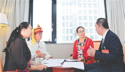 10月22日,王金花、羊风极、黄丽萍和黄春光等代表(由左至右)讨论如何把十九大精神贯彻到基层,推进精准扶贫工程。