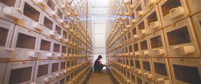养殖户在筛选黄粉虫,黄粉虫是蜘蛛的主食。 武昊 摄