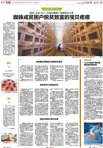 产业有需求,农民要脱贫,把蜘蛛养殖与五指山市脱贫攻坚结合起来,可谓一举多得,企业有了更可靠的蜘蛛原料供应,养殖户也从中获得一定收益,这也在一定程度上减轻了五指山市脱贫攻坚的压力。从2014年起,海南蛛王生物开发有限公司就尝试和当地政府、农户合作,一起发展蜘蛛养殖产业。目前该公司已经建成国内规模最大的蜘蛛养殖场,养殖规模可达到400万只,这也将带动农户走上一条别样的脱贫致富之路。