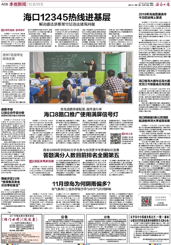 本报海口11月28日讯 (记者邓海宁 特约记者陈世清 通讯员林馨)记者今天从海口市公安局交警支队获悉,为充分利用空间资源,进一步提升路口通行率,海口已在市区部分路口推广使用满屏信号灯。目前,海口市区已在金垦路—东沙路交叉口、金垦路—金地路交叉口、金垦路—金牛路交叉口、滨湖路—三叶路交叉口、世纪大道—碧海大道交叉口、海甸三东路—海达路交叉口、人民大道—海甸四东路交叉口(东西双向)、滨海大道—金滩北路交叉口(南往西方向)等8个路口设立满屏信号灯。