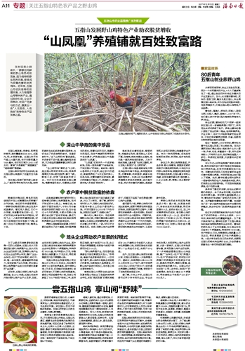 为了让更多的消费者尝到这难得一见的山间美味,五指山市大力发展五指山野山鸡养殖产业,加大对龙头企业的扶持力度,发挥野山鸡产业化龙头企业的带头作用,推行“企业+合作社+农户”的运作模式,实行产、供、销一条龙服务,增强辐射带动能力,促进家禽产业化发展,使五指山野山鸡养殖产业成为农民增收致富的“金凤凰”。