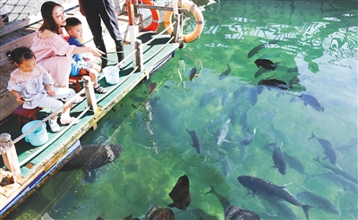 家长带着小朋友给鱼儿喂食。本报记者 武威 通讯员 童国强 摄
