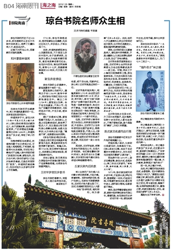 再后来,王时宇返琼,受聘在琼台书院担任山长,生徒大多有成就。他还曾经纂修《琼州府志》,亲自校注《白玉蟾集》、苏东坡的《海外集》《琼台诗话》《裨海摘要》等书。