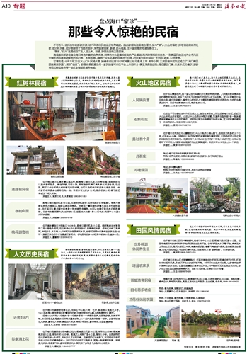 海南国际旅游岛省会海口拥有丰富的自然资源、深厚的文化底蕴和坚实的产业基础,利用政策和区位优势,一批精品民宿正成为全市乃至全省优质民宿旅游服务的先行者。本版将海口具有一定知名度的民宿进行归类,赶在春节前呈现给广大市民、游客,以供参考。