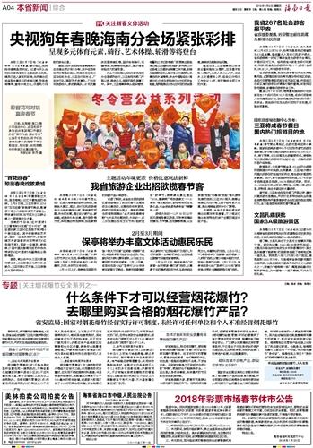 2月10日上午,保亭将在县图书馆一楼大厅开展“迎新春·送春联”活动,将组织该县书法家协会会员、书法爱好者为群众撰写春联,以书法文化惠民的方式喜迎新春。2月12日晚,该县将在县七仙广场举行2018年保亭迎新春文艺晚会。保亭民族歌舞团将以新时代“红色轻骑兵”为指引,为市民呈现一台精彩的晚会,让百姓通过歌舞节目感受新春氛围。