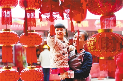 琼海市民带着孩子选购红灯笼。 特约记者 蒙钟德 摄