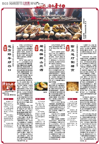 文\海南日报记者 李佳飞 实习生 韦思瑶琼海人过年有很多风俗。年前家家户户就忙着打扫室里室外卫生,连箩筐家具也洗刷一遍,把内内外外都收拾得干干净净。然后把几件破旧的东西拿到村口放火烧掉,称为“送穷”,意思是把那些晦气全部送掉,以换来新一年的好运气。