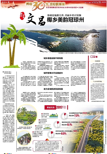 “‘两桥一路’(铺前大桥、清澜大桥、滨海旅游公路)工程不仅改善了交通格局,助推文昌加快融入海澄文一体化,未来城乡面貌还将发生翻天覆地的变化。”文昌市委书记钟鸣明说,30年经济社会的发展,为文昌打下了良好的基础。新时代新征程,对标中央和省委要求,接下来,文昌将聚焦十二大产业,继续深化供给侧结构性改革,“一方面要大力发展新兴产业,助推航天城建设;另一方面,将以美丽海南百镇千村工程为抓手,重振东郊椰林这张海南旅游老品牌,发力全域旅游”。