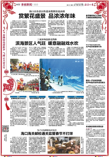 据了解,春节前海口向国内外游客发出了“请到海口过大年——幸福欢乐共团圆”的邀请,依托海口的生态优势和旅游资源,推出了四种玩法八条精品线路。截至今天14时许,海口市9家A级景区及主要景区、乡村点共接待游客26.4万人次,同比增长9.65%,其中海口火山口公园、海南热带野生动植物园等景区客流量均创下历史最高纪录。全市消费品零售总额约为2.82亿元,同比增长10.25%,其中大型商场、超市实现销售额约2.43亿元,同比增长10.3%;全市餐饮业实现销售额约2900万元,同比增长11.07%。